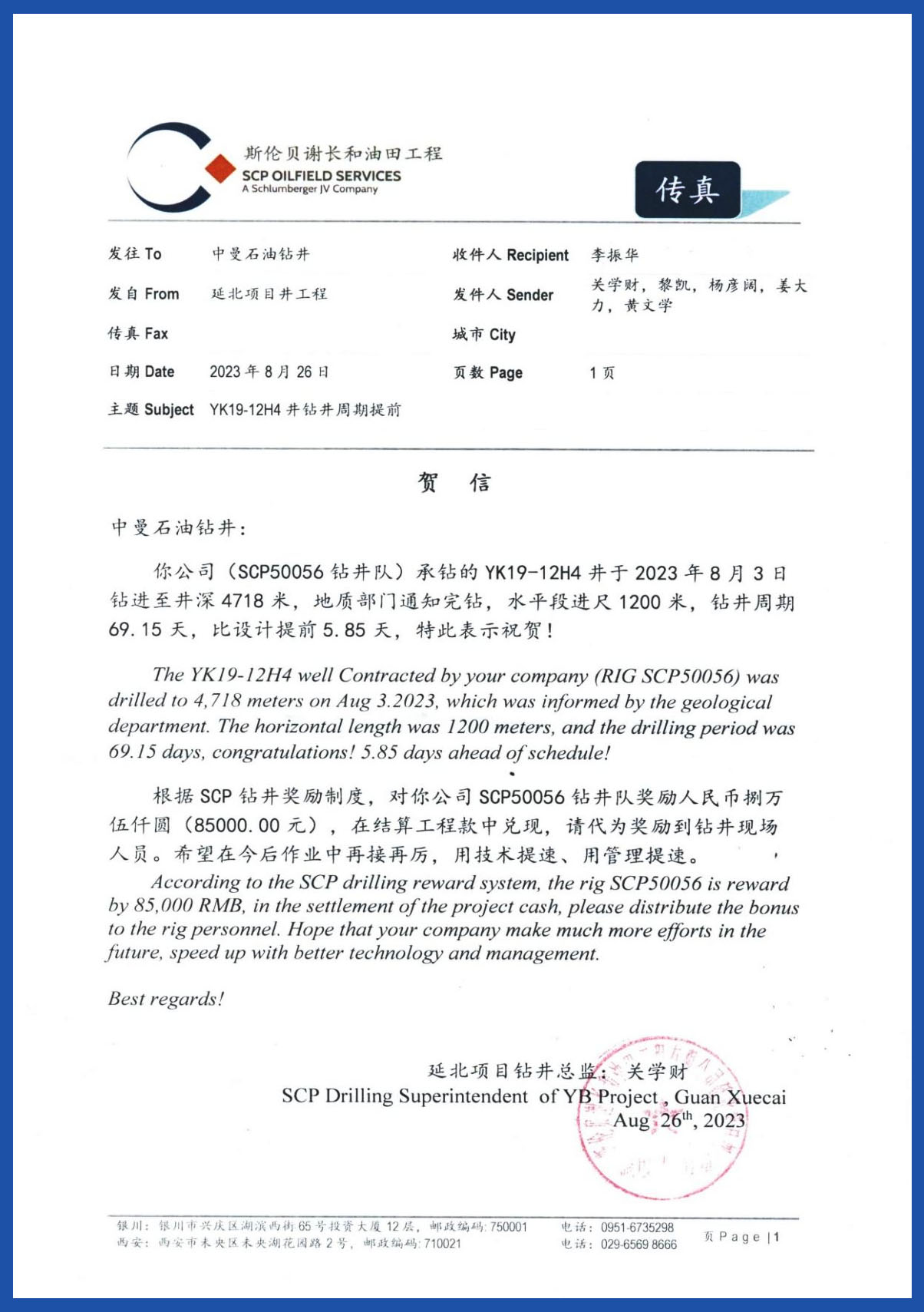 8月15日,由中曼钻井延安项目2队承钻的YK19-12H4井以提前设计周期5.85天的成绩顺利完井,甲方斯伦贝谢长和油田延北项目部第一时间发来贺信,并给予8.5万元奖励。
