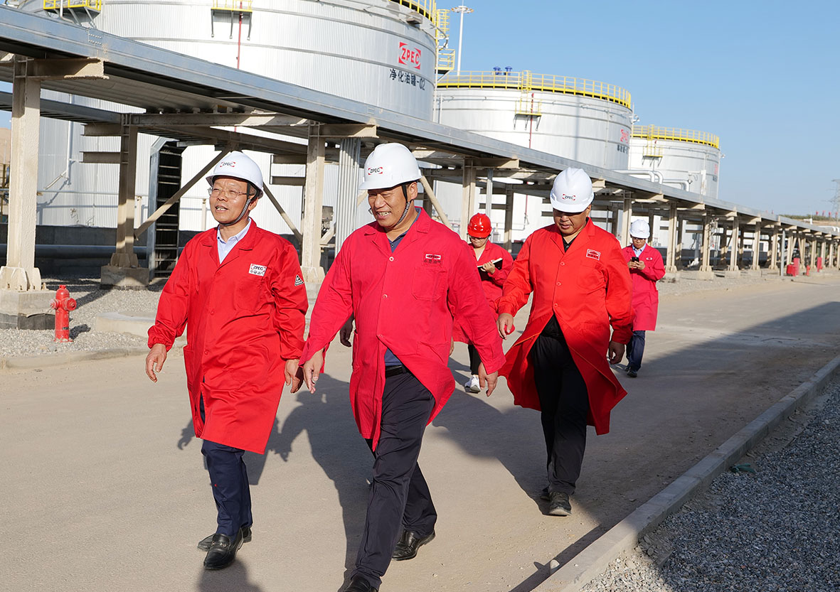 王柏苍先后参观了中曼阿克苏油田温7区块温7采油井站、地面工程建设项目现场,详细了解了中曼石油的发展历程、一体化优势、温宿区块勘探开发进程以及地面工程建设项目进展等。