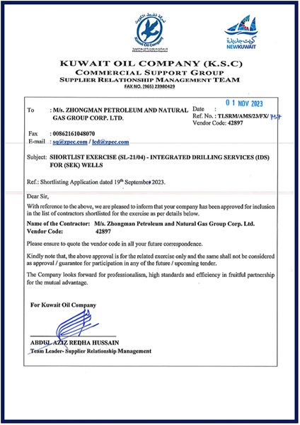 11月1日,科威特国家石油公司(KOC)传来喜讯,中曼石油成功通过了科威特国家石油公司(KOC)的工程大包服务资格审查,正式获得科威特东南地区综合钻井服务承包商资质。本次获得综合钻井服务承包商资格代表公司在综合钻井工程服务业务的各项能力获得了国际高端石油公司的认可和肯定。