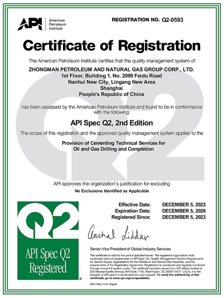 中曼石油成功取得美国石油协会API Q2固井认证证书