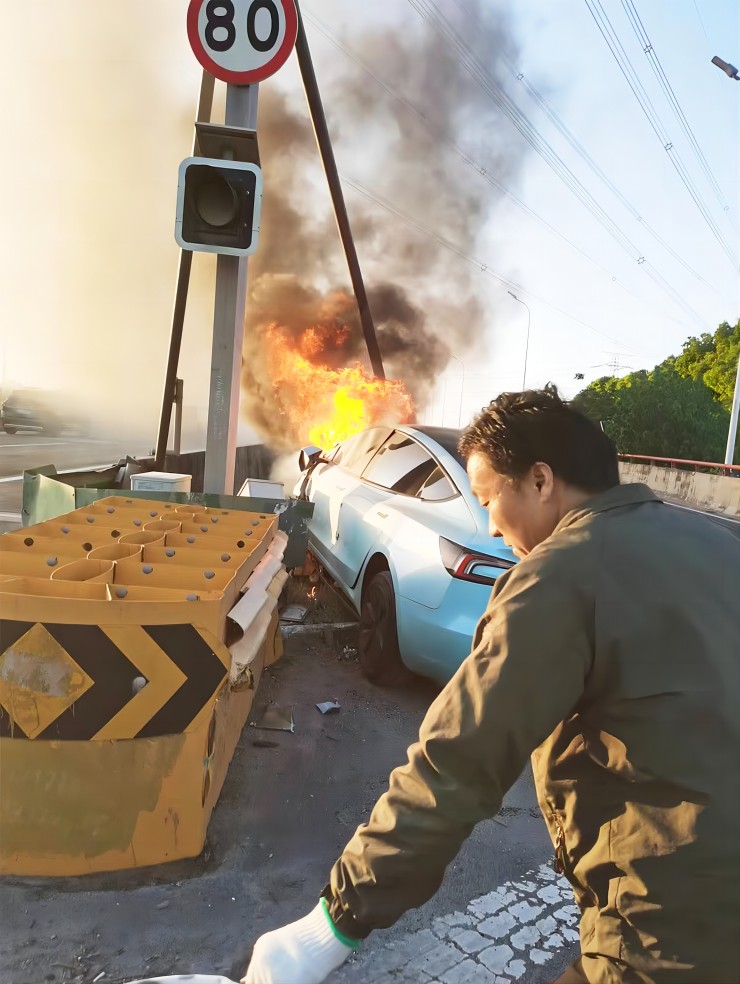 当天下午,公司班车行驶至康桥收费站北500米处位置时,坐在前排的李和平看到前方路边停了一辆白色轿车,前机盖处冒出浓烟,车辆周围没有人的现象使他感觉驾乘人员还在车内。紧急停车后,他和赵峰、熊传银、俞耀峰、朱庆武等同事拿着车载灭火器迅速冲到车辆跟前,开展灭火救援,电动轿车被撞后车门无法打开,李和平随即返回大巴拿来消防锤砸破玻璃,大家齐心协力把车主从车窗拉出来,车内烟雾很浓,车主呼吸到新鲜空气后总算缓过气来。此时,车载灭火器已无法阻止火势蔓延,两分钟后大火淹没了整个车身,正当大家万分焦急时,119消防车及时赶到现场,对起火车辆一起进行扑救,火情得到彻底控制。