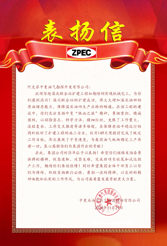 近日,中曼石油温北联合站扩建工程顺利实现机械完工,集团公司对中曼油气予以表扬,充分肯定了中曼油气在温北联合站扩建工程中所作出的贡献,为项目高质量建成投产奠定了坚实基础。